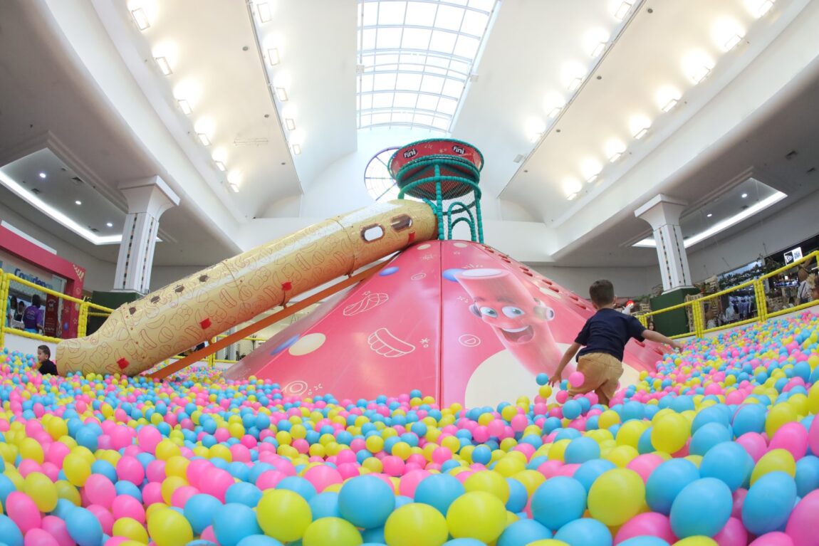 A Praça 3 de Eventos do Riopreto Shopping foi transformada em um grande parque de diversões com brinquedos como escorregadores, casinha na árvore, jipe, elefantes, girafas…