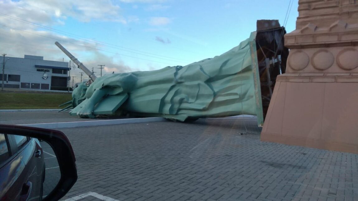 Eitaaaa! Uma estátua da Havan foi parar na ‘chón’ após uma forte ventania, nesta segunda-feira (24), em Capão da Canoa, cidade litorânea do Rio Grande do…